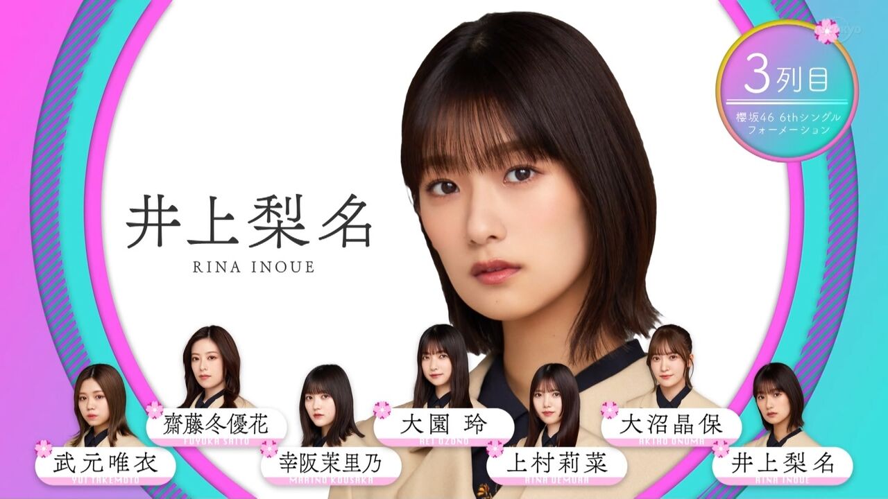 3列目左から:武元唯衣、齋藤冬優花、幸阪茉里乃、大園玲、上村莉菜、大沼晶保、井上梨名