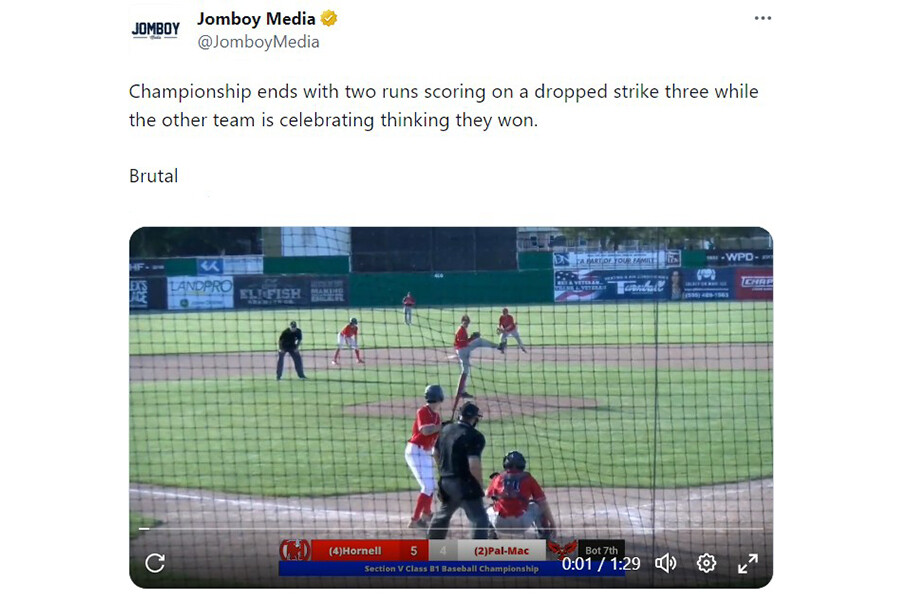 米高校野球でルールを知っているか否かで明暗が分かれた。1点を追う最終回2死一、二塁で打者が見逃し三振。試合終了と思いきや、振り逃げが成立した。知らなかった守備側は勝利に大喜びする一方、攻撃側は一挙に2人が生還し、逆転サヨナラ勝ちした。米メディアが27日の試合動画を公開。米ファンから「酷い負け方だ」「二塁手は走って声をかけてる」と指摘が相次いだ。