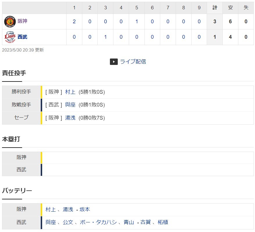 【交流戦】西武1ー3阪神 試合結果 ベルーナドーム 2023/5/30