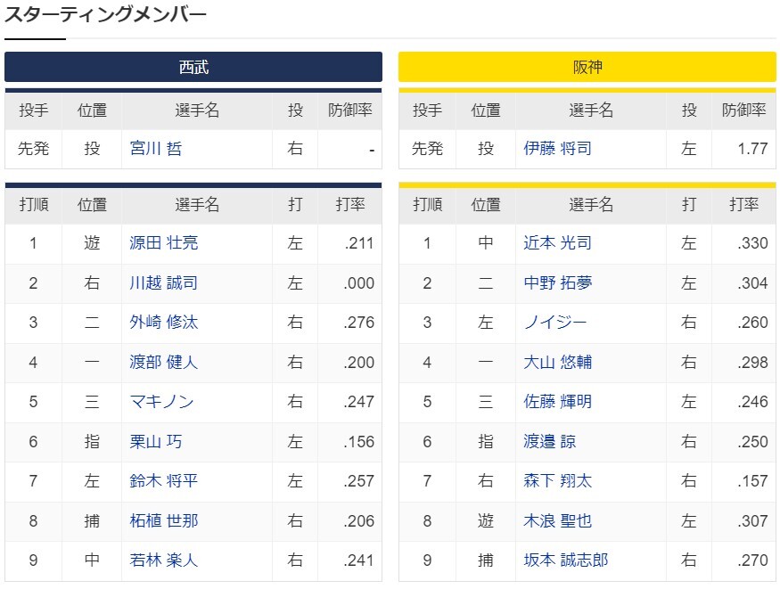 【交流戦】西武ー阪神 スタメン ベルーナドーム 2023/6/1