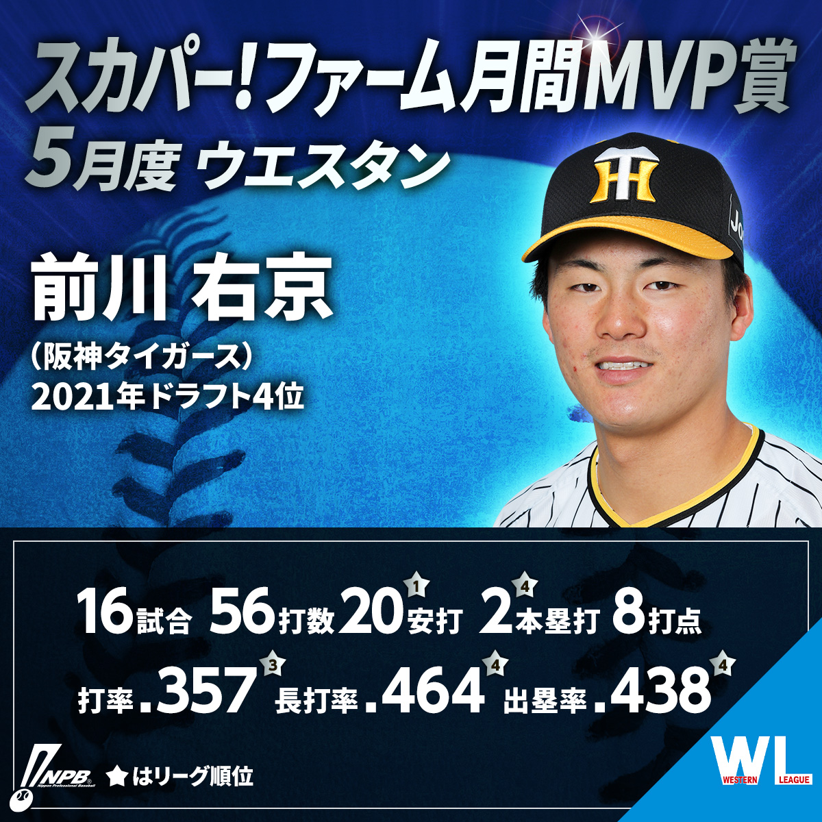 イースタン、ウエスタン両リーグが制定する「スカパー!ファーム月間MVP賞」 の5月度の受賞選手が決定し、ウエスタン・リーグ部門で前川右京選手が選ばれ