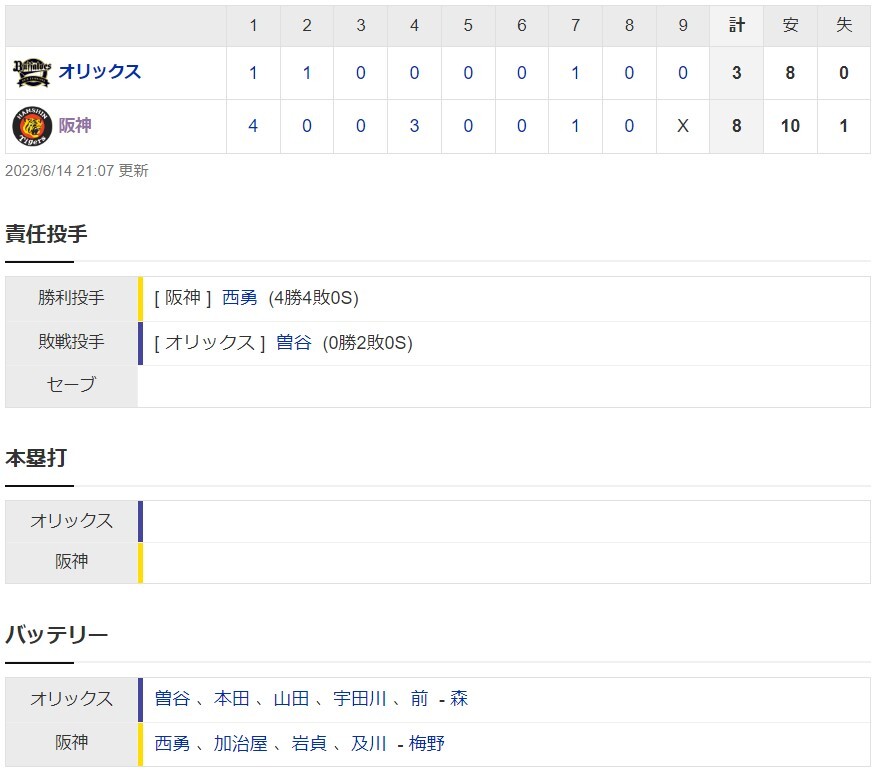 【交流戦】阪神8ー3オリックス 試合結果 甲子園球場 2023/6/14