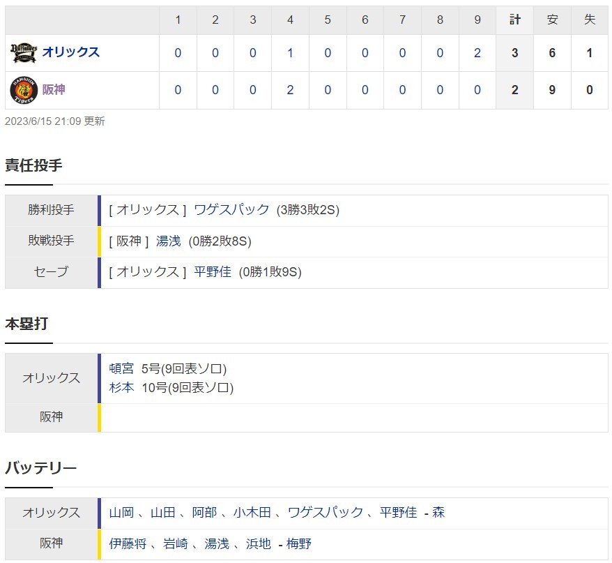 【交流戦】阪神2ー3オリックス 試合結果 甲子園球場 2023/6/15