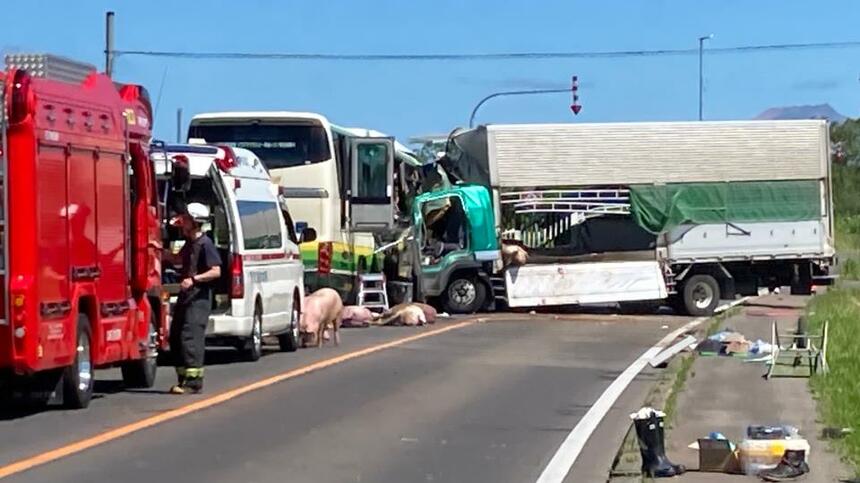 高速バスとトラックが衝突 15人けが そのうち2人~3人が心肺停止 トラックに積まれていたブタも逃げ出す 北海道八雲町