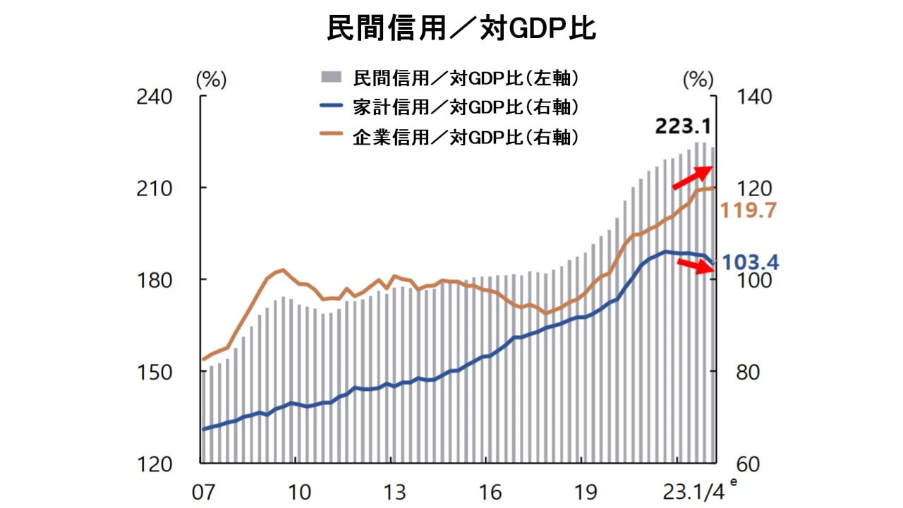 2023年第1四半期時点での家計信用、企業信用の残高を対GDP比で示しています。
