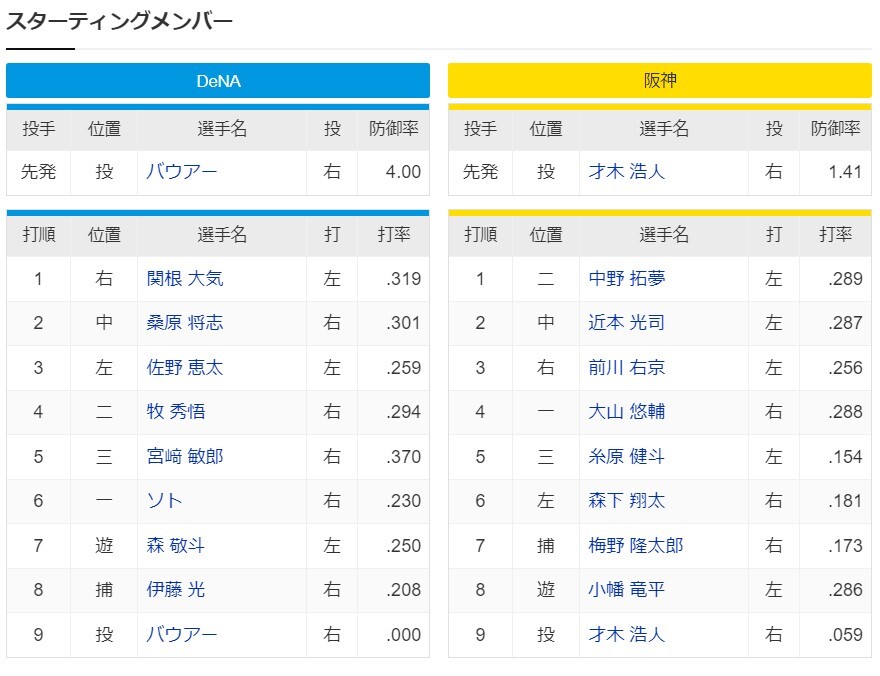 DeNA-阪神 スタメン 横浜スタジアム 2023/6/25