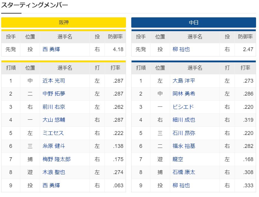 阪神ー中日 スタメン 甲子園球場 2023/6/27