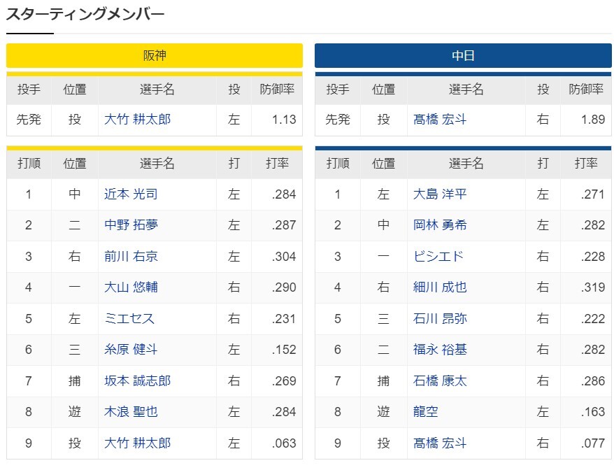 阪神ー中日 スタメン 甲子園球場 2023/6/28