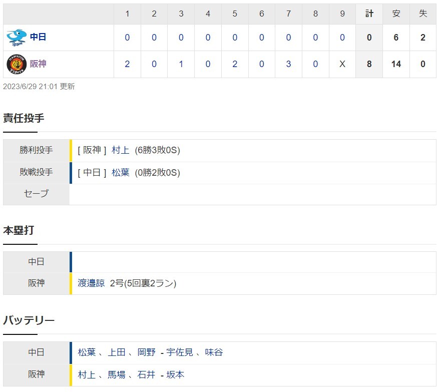 阪神8ー0中日 試合結果 甲子園球場 2023/6/29