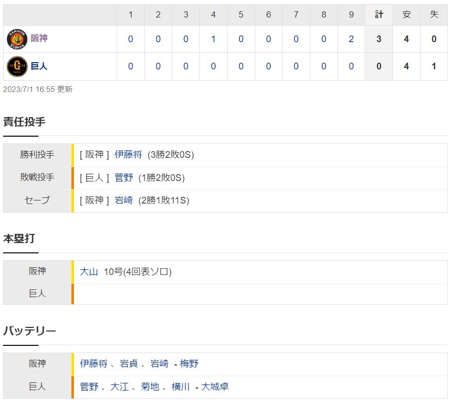 巨人0ー3阪神 試合結果 東京ドーム 2023/7/1