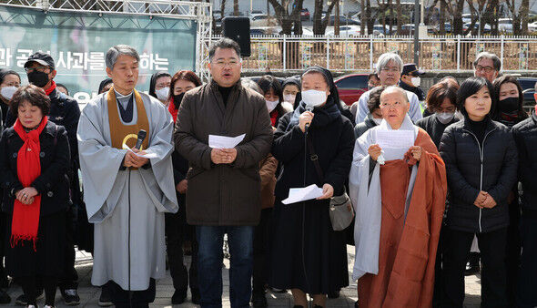 4月14日、ソウル龍山区の戦争記念館前で開催された「大統領の面談と公式謝罪を求める10・29梨泰院惨事4教団祈祷会」で、各教団の宗教家たちが立場を発表している=キム・ヘユン記者