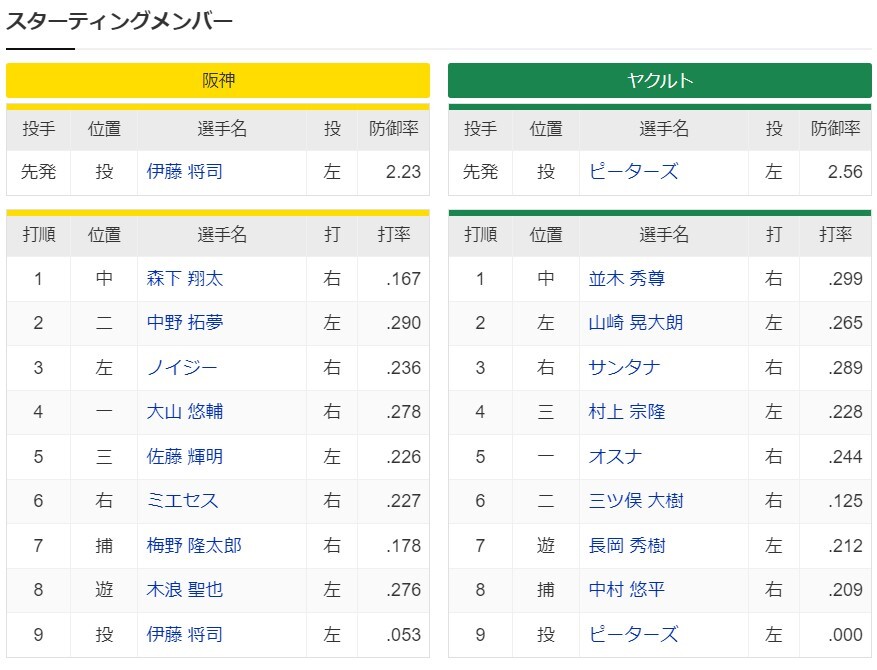 1番 中堅 森下 2番 二塁 中野 3番 左翼 ノイジー 4番 一塁 大山 5番 三塁 佐藤輝 6番 右翼 ミエセス 7番 捕手 梅野 8番 遊撃 木浪 9番 投手 伊藤将