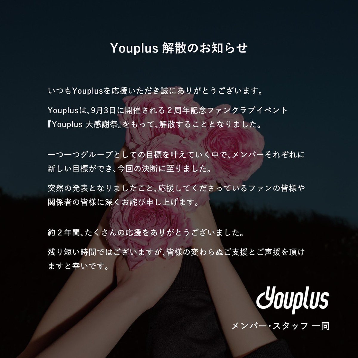 【Youplusから大切なお知らせ】と題した文書で「2周年を迎える2023年9月3日をもって、解散することとなりました。」と報告した。