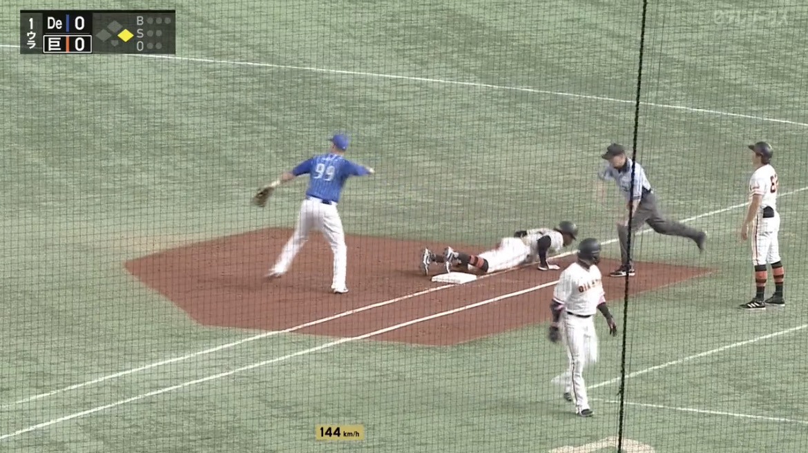 だが、続く2番・丸の左前に落ちそうな飛球を佐野がスライディングキャッチ。ブリンソンは慌てて一塁へ戻ったが、佐野の送球のほうが早く併殺となった。
