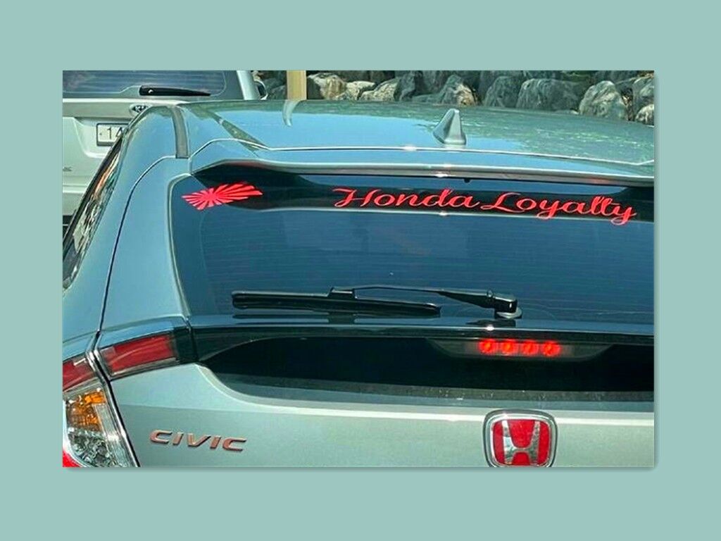 車種はホンダ・シビックで、リアガラスの左上部分に赤い旭日旗柄のステッカーが貼られている。