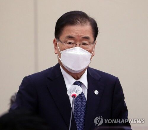 国会外交統一委員会の全体会議に出席した鄭長官=28日、ソウル(聯合ニュース)