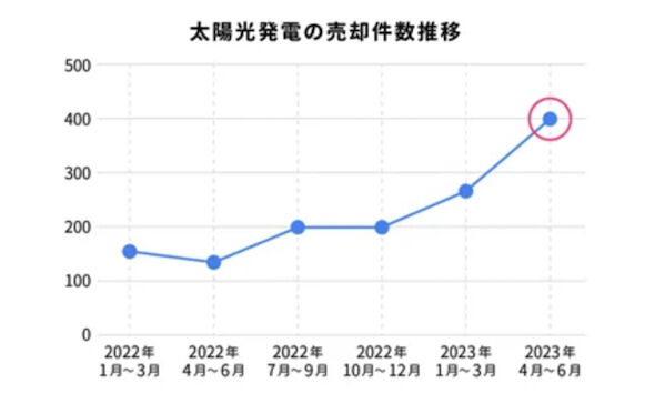 太陽光発電所の売却件数は2022年は緩やかに増えていたが、2023年から急激に増加した。増加率は昨年の2倍ペースとなっており、直近3カ月(2023年4~6月)は前年比3倍に拡大しているという。