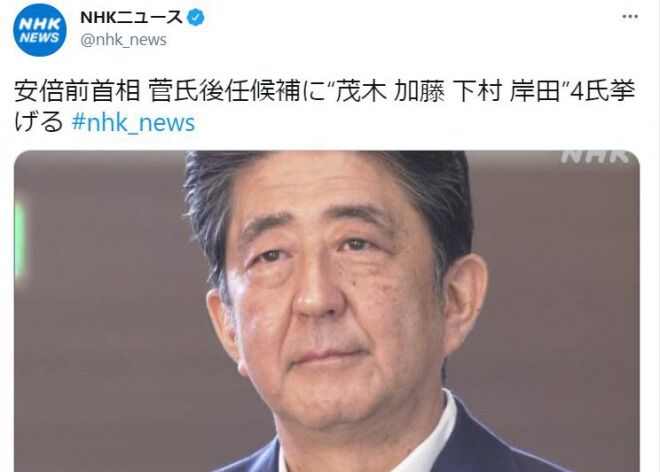 NHKが取り上げた安倍氏の発言は菅義偉首相の後任人事を巡る内容で、後任の総裁候補として茂木外務大臣や加藤官房長官、下村政務調査会長、それに岸田前政務調査会長の4人が浮上していると言及した場面です。