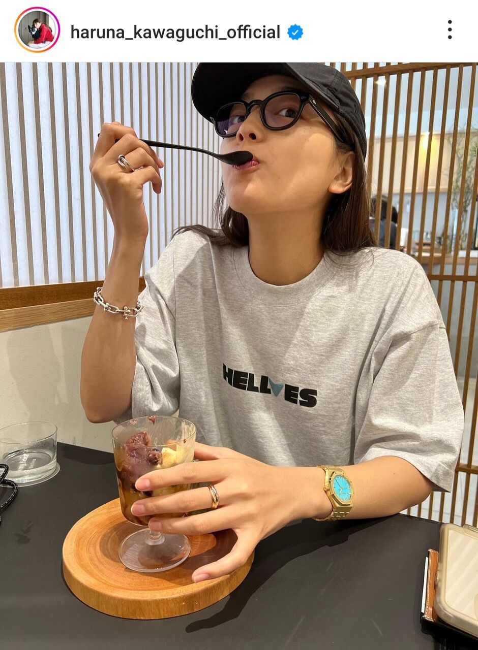 1枚目は黒いキャップに黒縁の眼鏡をかけ、ヘザーグレーのTシャツを着た川口さんがグラスに入ったデザートを食べている写真だ。