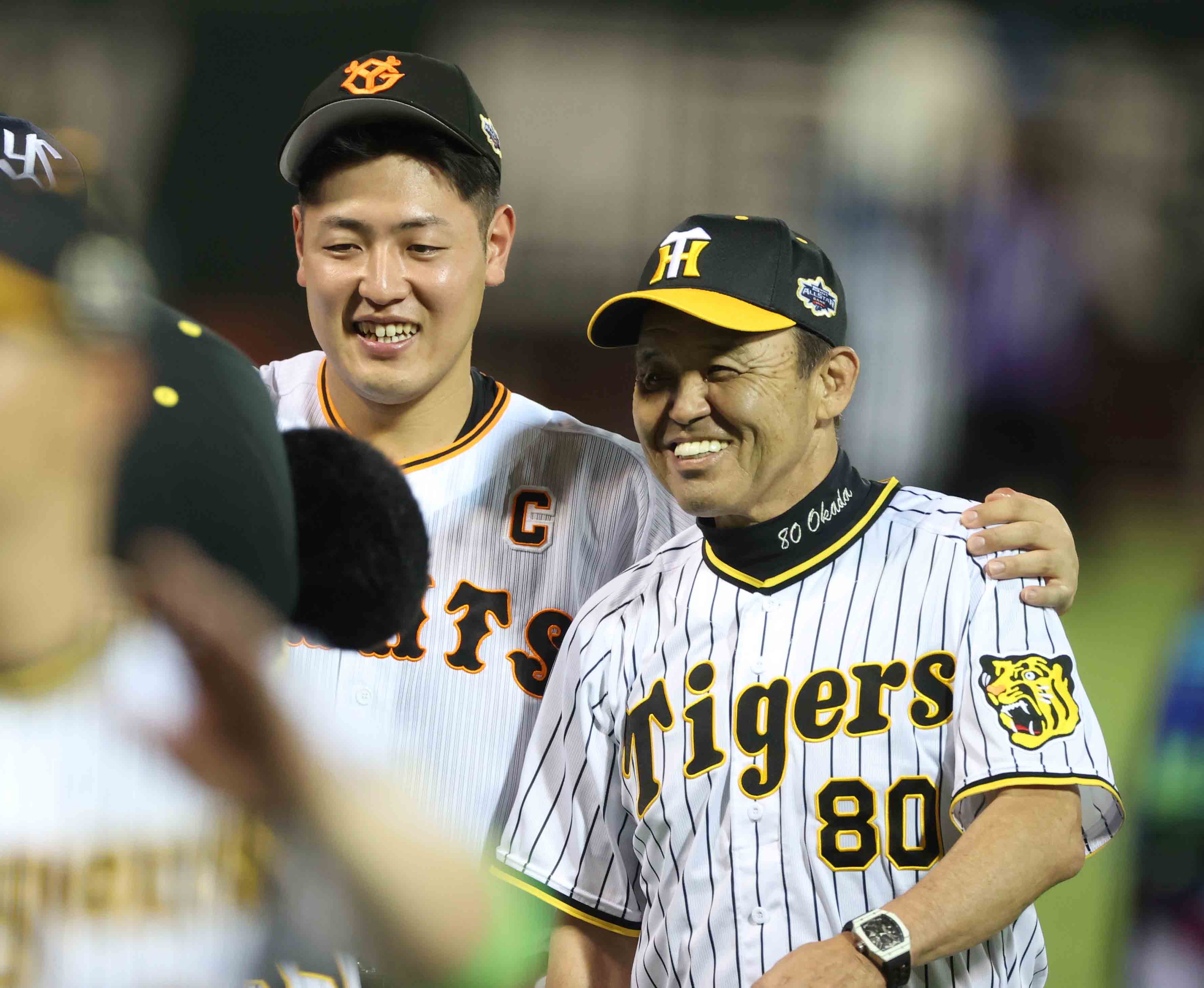 巨人・岡本、阪神・岡田監督の肩を抱く