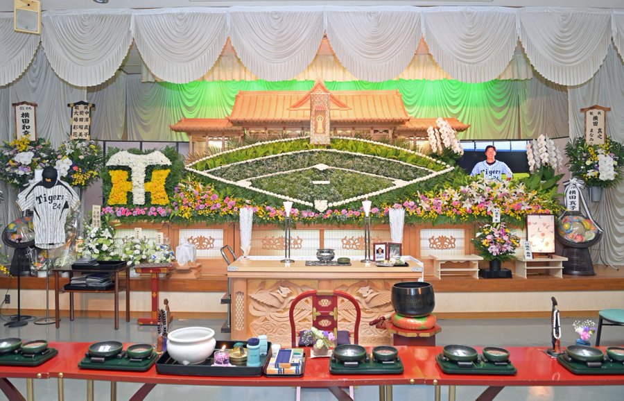 野球場がデザインされた祭壇には阪神のユニホームを着た横田さんの写真、背番号24の縦じまユニホーム、白と黄色の花で作られた阪神のロゴも飾られた。