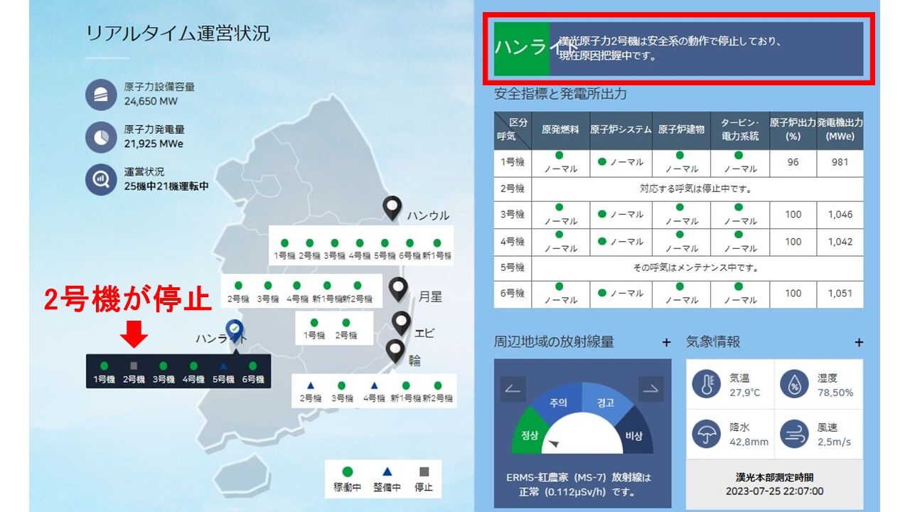 ↑韓国原発のリアルタイムステータス。2023年07月25日22:15現在のスクリーンショット。確かに2号機は運転を停止しています。