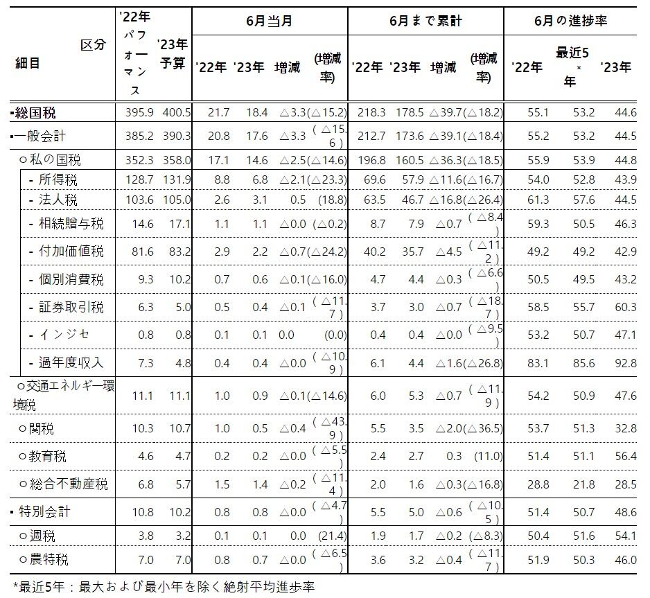 01~06月の累計国税収入は「178.5兆ウォン」、対前年同期比で「-39.7兆ウォン」です。