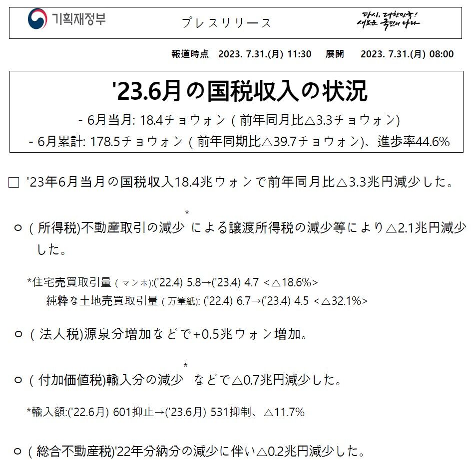 ⇒参照・引用元:『韓国 企画財政部』公式サイト「’23.06月の国税収入の状況」