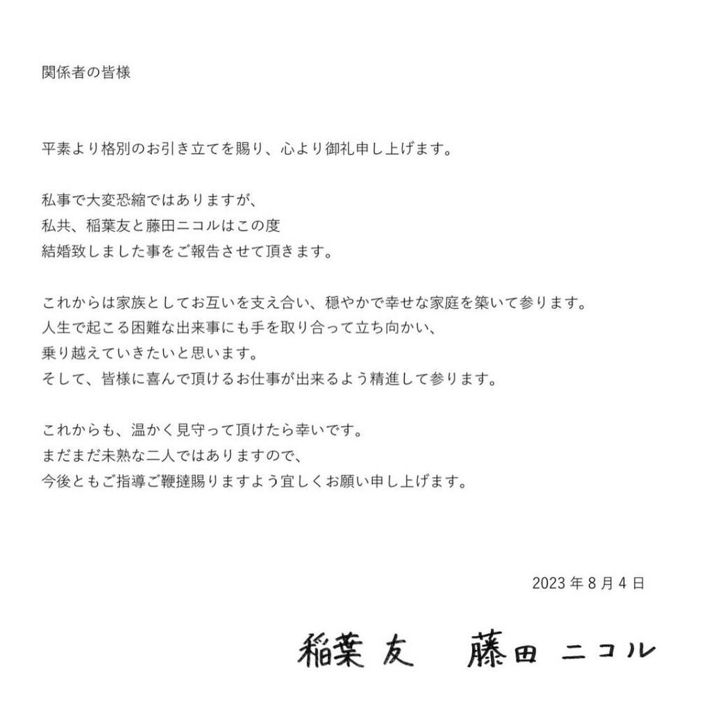 藤田と稲葉は連名で「私事で大変恐縮ではありますが、私共、稲葉友と藤田ニコルはこの度結婚致しました事をご報告させて頂きます」と結婚を報告。「これからは家族としてお互いを支え合い、穏やかで幸せな家庭を築いて参ります。人生で起こる困難な出来事にも手を取り合って立ち向かい、乗り越えていきたいと思います」と伝え、「そして、皆様に喜んで頂けるお仕事が出来るよう精進して参ります」と今後に意気込みを見せた。