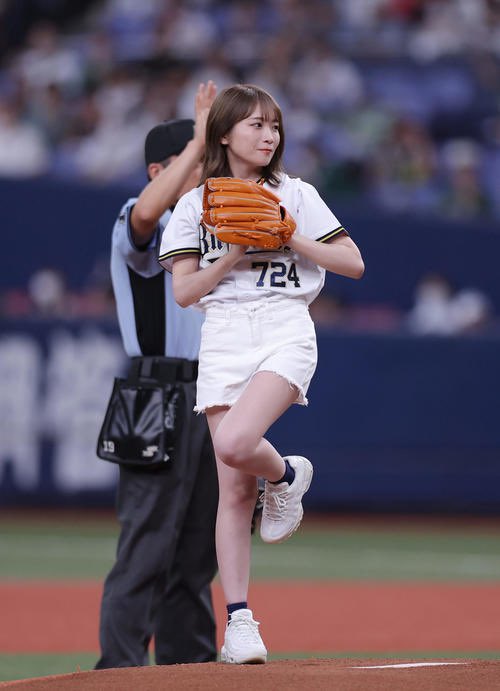 秋元真夏、始球式で豪快ワインドアップ投法披露