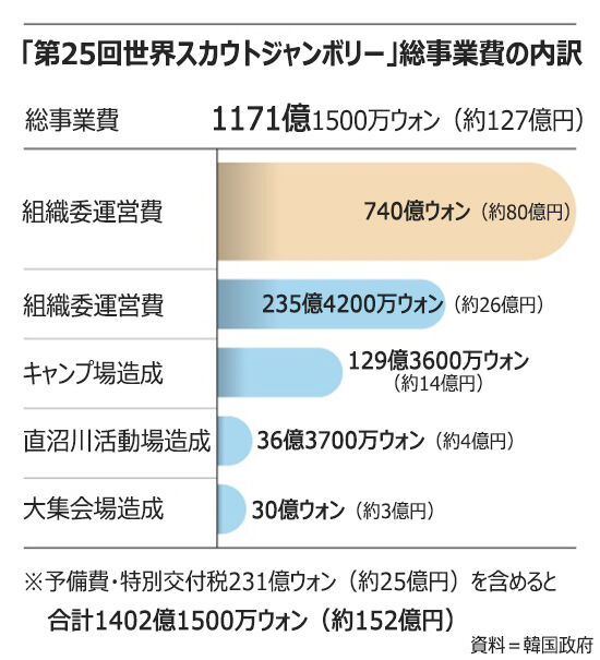 韓国女性家族部や全羅北道など主催者側の世界スカウトジャンボリー総事業費は1171億ウォン余り(約127億円)だ。このうち、組織委員会の人件費といった運営費だけで740億ウォン(約80億円)を超える資金が投入されていたことが分かった。その一方で、トイレ・シャワーなどキャンプ場施設造成に投入したのは129億ウォン(約14億円)だった。与党・国民の力は6日、「ジャンボリー予算1000億ウォンの使途が疑われる」として、調査の必要性を提起した。