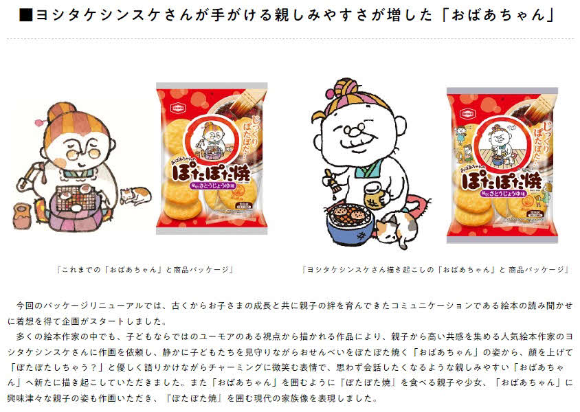 亀田製菓『ぽたぽた焼』リニューアルでよりチャーミングな「おばあちゃん」に 新イラストは人気絵本作家ヨシタケシンスケ氏