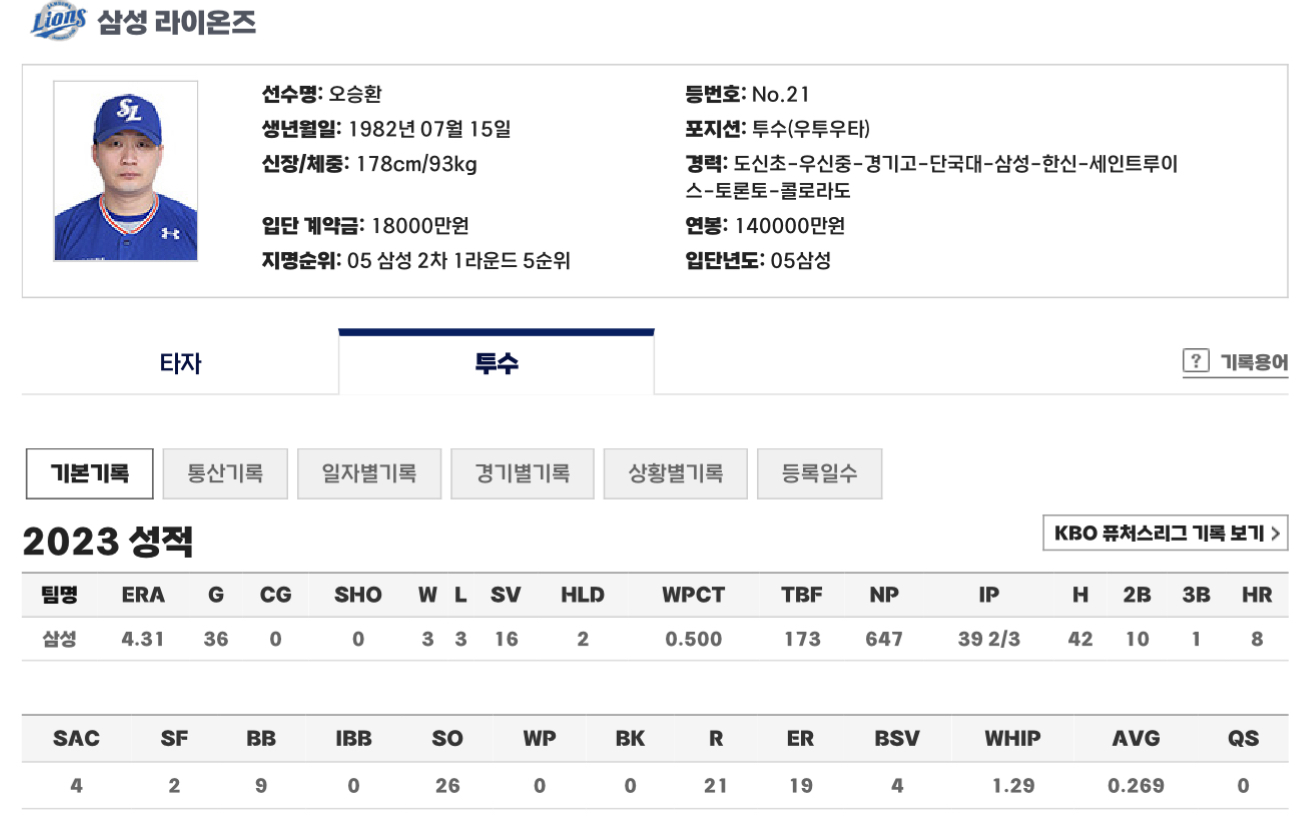 元阪神オ・スンファン(41) 防御率4.31 36試合 3勝 3敗 16S 2H 39.2回 26奪三振 WHIP1.29
