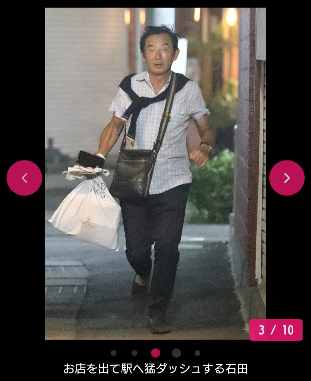 23時過ぎ、お店を出た石田は駅へ猛ダッシュ!この時間の駅周辺は人もまばらだが、さすがに石田に気が付く人は多く、みんな振り返っている。ギリギリで電車に乗りこんだ石田は安堵した様子を浮かべていた。