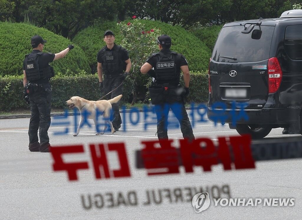 爆破予告メールを受け、大邱市庁内を捜索する警察の特殊部隊と探知犬=16日、大邱(聯合ニュース)