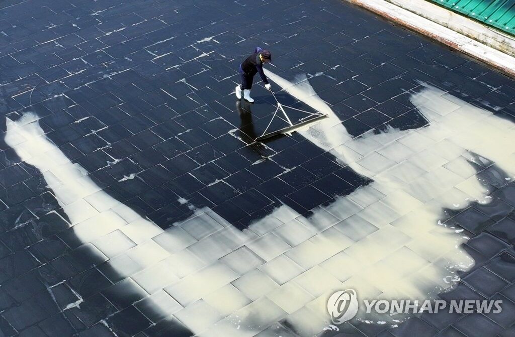南西部・全羅南道霊光郡の塩田で、海水を蒸発させるための排水作業が行われている=(聯合ニュース)