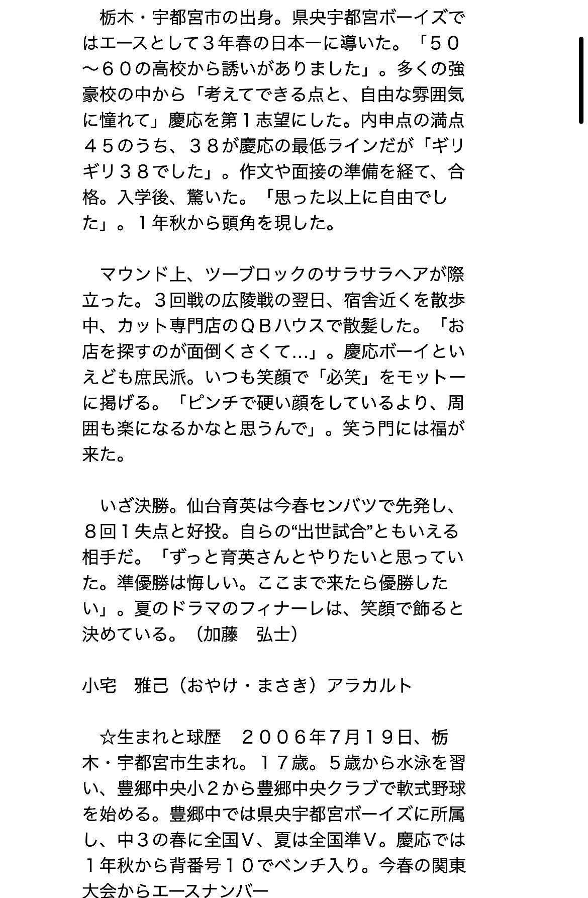 栃木・宇都宮市の出身。県央宇都宮ボーイズではエースとして3年春の日本一に導いた。「50~60の高校から誘いがありました」。多くの強豪校の中から「考えてできる点と、自由な雰囲気に憧れて」慶応を第1志望にした。内申点の満点45のうち、38が慶応の最低ラインだが「ギリギリ38でした」。作文や面接の準備を経て、合格。入学後、驚いた。「思った以上に自由でした」。1年秋から頭角を現した。