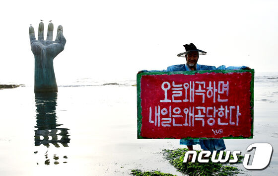 書道家のキム・ドンウクさんが顕忠日(大韓民国の殉国者と戦没将兵を追悼する記念日=6月6日)を控えた2日、慶北(キョングク)浦項市(ポハンシ)南区(ナムグ)虎尾岬(ホミゴッ)の共生の手前で、殉国烈士たちの国精神を振り返る書道パフォーマンスを展開した。