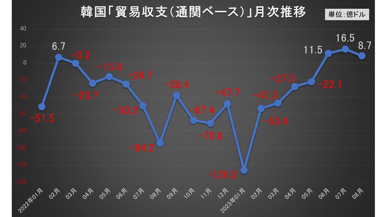 【韓国】8月は予想どおり「貿易黒字わずか8.6億ドル」 輸出-8.4% 輸入-22.8% 不況型黒字は明白