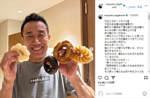 全国ツアー中の長渕さんは、「今日こそチートデイだ! 今日の名古屋は過去最高だ!!」と名古屋公演を終えた深夜にInstagramを更新。たくさんのドーナツを両手の指に掛け、無邪気な笑顔を浮かべたソロショットを公開しており、普段のワイルドな出で立ちとのギャップが激しい姿となっています。