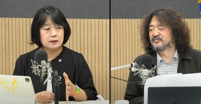 ▲5日、動画共有サイト「ユーチューブ」のチャンネル「金於俊(キム・オジュン)の謙遜はつらいよニュース工場」に出演した無所属の尹美香(ユン・ミヒャン)議員。写真=ユーチューブより