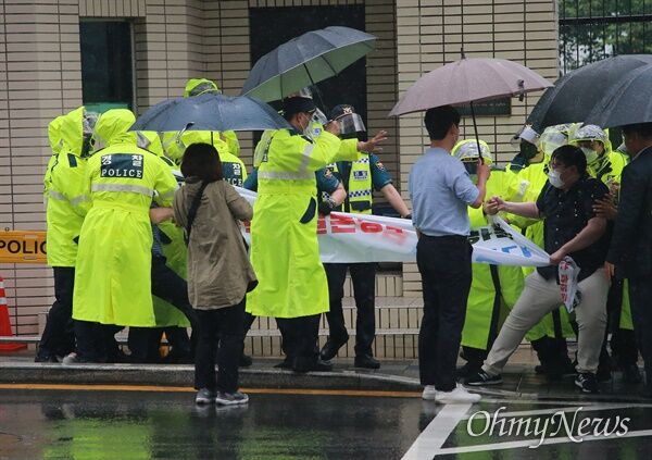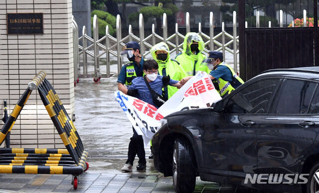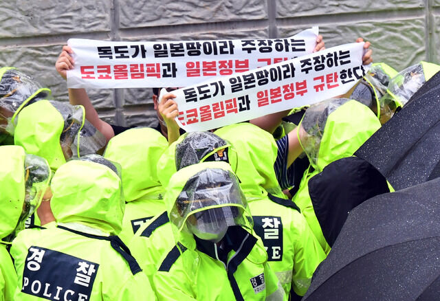 その後、総領事館前には数回にわたり警告放送が流れたが、学生らは雨の中で1時間近く「独島(竹島の韓国名)が日本の領土と主張する日本政府に反対する」と書かれた横断幕を掲げていた。