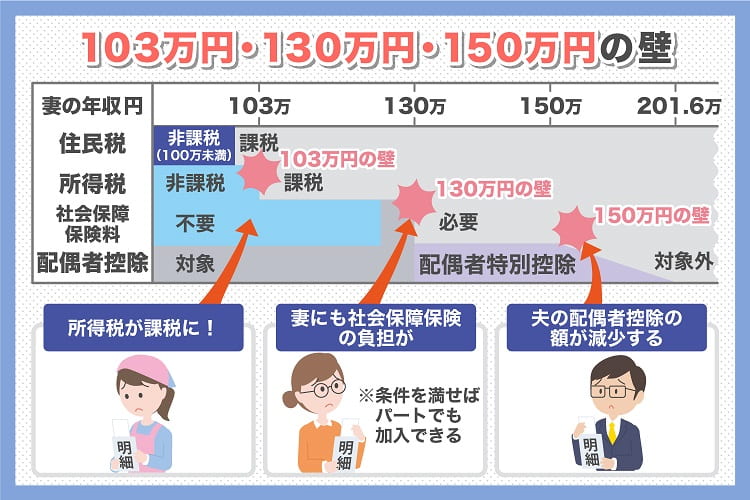 社会保険の適用が企業の従業員数などによって異なるため、年収の壁は複数存在する。従業員100人以下の場合は年収130万円以上になると扶養から外れ、社会保険料を納める必要があり、「130万円の壁」と呼ばれる。手取りが減る一方、将来的に受け取れる年金額が変わらないため、パート労働者らの間で「就業調整」が発生。人手不足に拍車をかけていた。