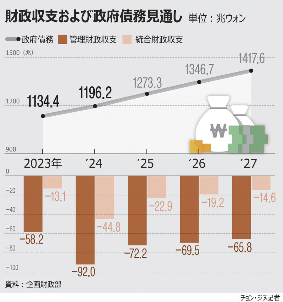 大半が借り入れ(600兆5000億ウォン増)や起債(118兆7000億ウォン増)だった。