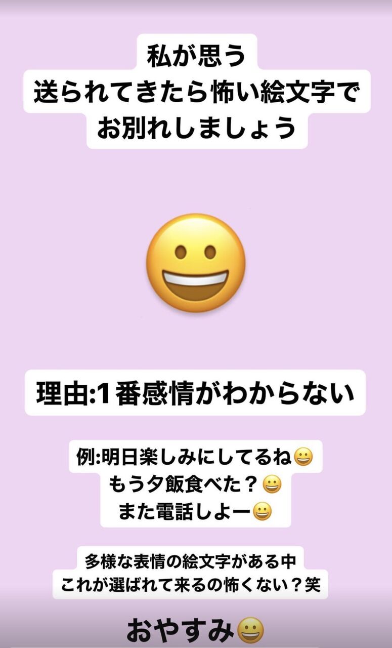 怖い理由として「感情が分からない」と述べたうえで、「明日楽しみにしてるね(顔文字)・もう夕飯食べた?(顔文字)・また電話しよー(顔文字)」と3つの文章と共に“怖い絵文字”の使用例を挙げた。