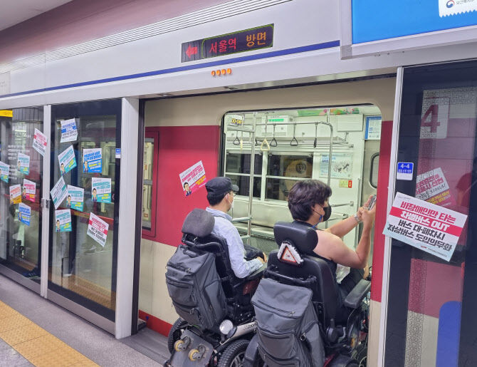 ソウル障がい者差別撤廃連帯はこの日の午後、オ・セフン(呉世勲)ソウル市長に「障がい者移動権増進のためのソウル市宣言」履行と面談を要求し、地下鉄1号線のシチョン(市庁)駅で地下鉄のドアが閉まらないように車いすで塞ぎ、運行ができないようにするデモを行った。