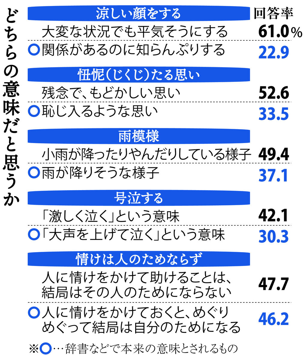 「涼しい顔をする」を「大変な状況でも平気そうにする」の意味で使う人が61%に上ることが29日、文化庁の国語に関する世論調査で分かった。本来の意味とされる「関係があるのに知らんぷりをする」と答えたのは22%だった。