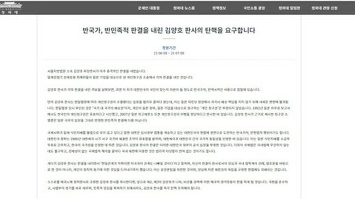 8日、大統領府ホームページの国民請願掲示板には「反国家、反民族的判決を下したキム・ヤンホ裁判官の弾劾を要求します」という請願文が掲載された。
