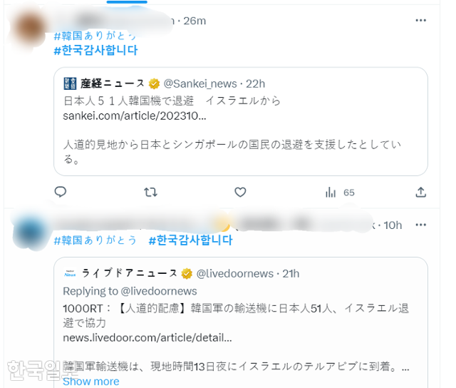 15日、日本社会関係網サービス(SNS)とオンラインコミュニティなどにはイスラエルで日本国民を輸送機に一緒に乗せて帰国してくれた韓国政府に感謝を表わす文が続いている。