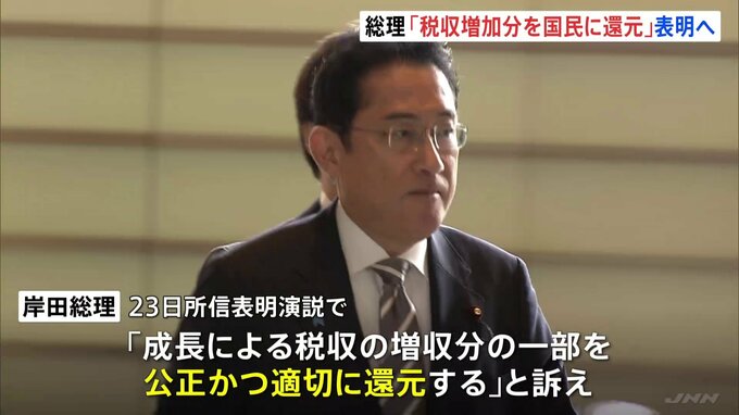 複数の政府・与党関係者によりますと、来週23日に行われる所信表明演説の中で岸田総理は、急激な物価高に賃上げが追いついていない現状に触れたうえで、「成長による税収の増収分の一部を公正かつ適切に還元する」と訴えます。